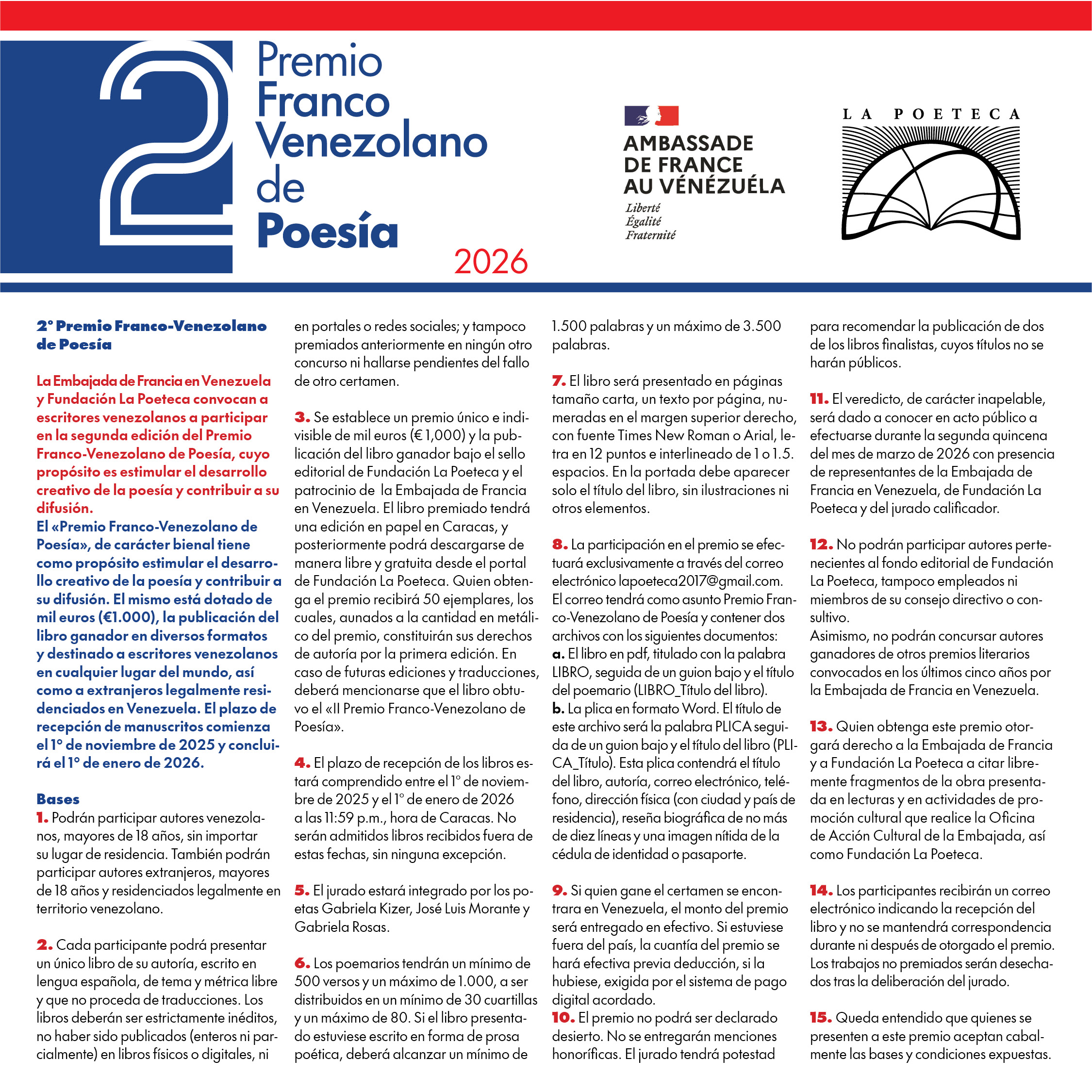 La Embajada de Francia en Venezuela y Fundación La Poeteca convocan a escritores venezolanos a participar en la segunda edición del Premio Franco-Venezolano de Poesía.